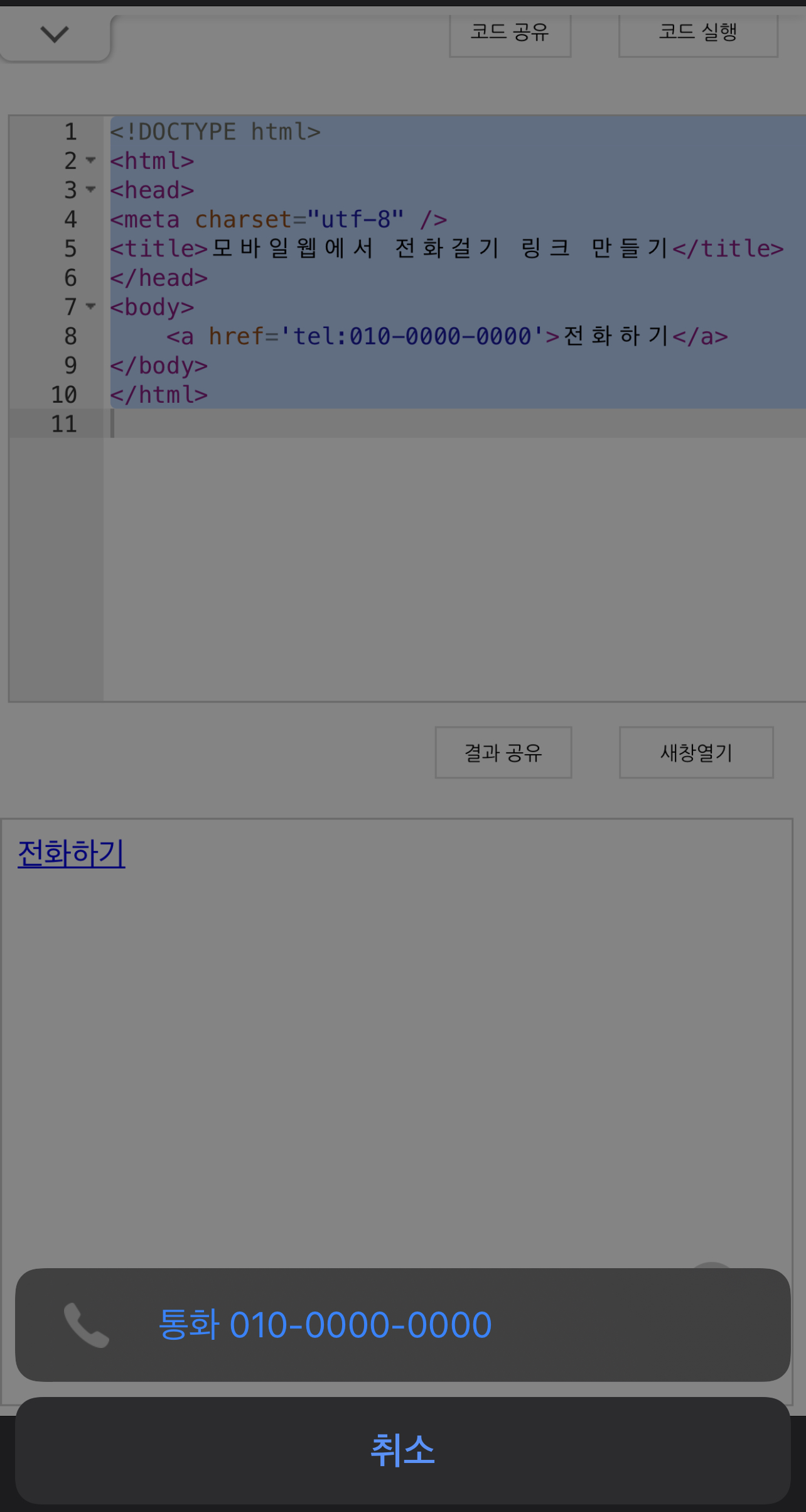 <!DOCTYPE html> <html> <head> <meta charset="utf-8" /> <title>모바일웹에서 전화걸기 링크 만들기</title> </head> <body> <a href='tel:010-0000-0000'>전화하기</a> </body> </html>